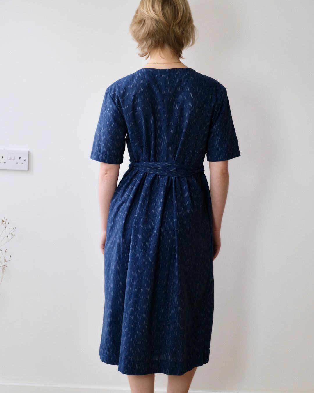 Sylvia is based on our sleeveless Frida style, shown here in a beautiful Ikat weave. A Separate tie belt can be tied in many different ways.