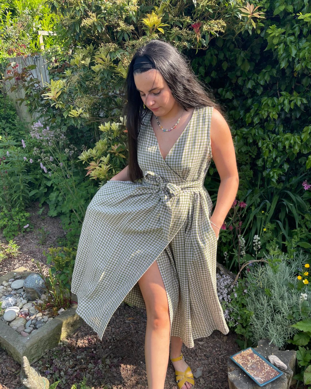 A reversible wrap dress secured with ties. Frida has deep side seam pockets that will hold all your essentials. Bound armholes provide a neat finish. It transitions through the seasons by layering in cooler weather. Ties fasten front or back.