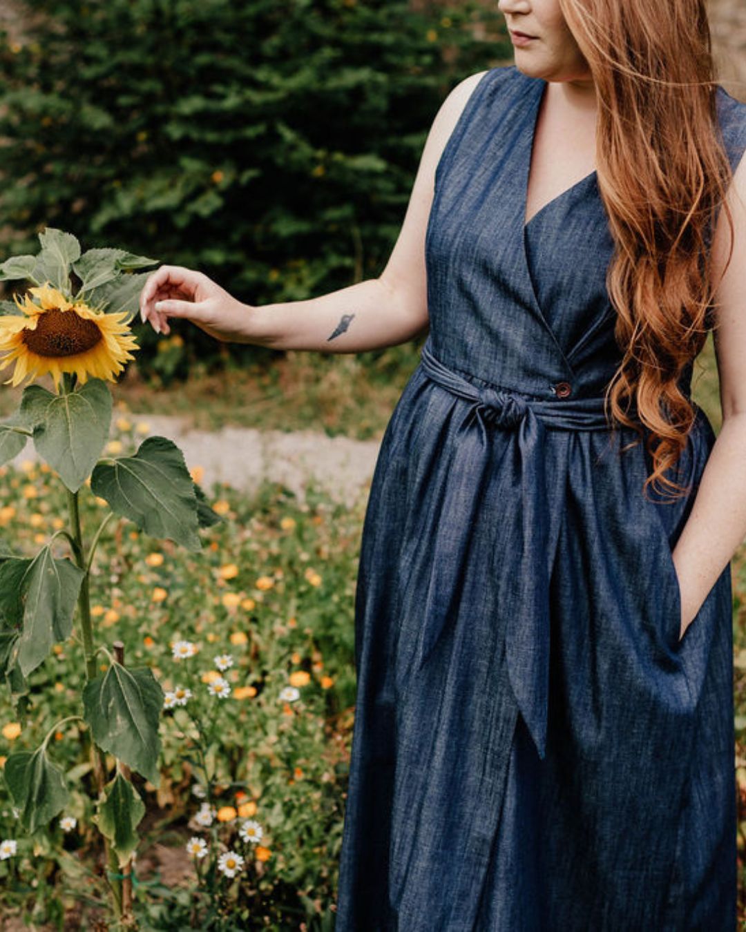A reversible wrap dress secured with ties. Frida has deep side seam pockets that will hold all your essentials. Bound armholes provide a neat finish. It transitions through the seasons by layering in cooler weather. Ties fasten front or back.
