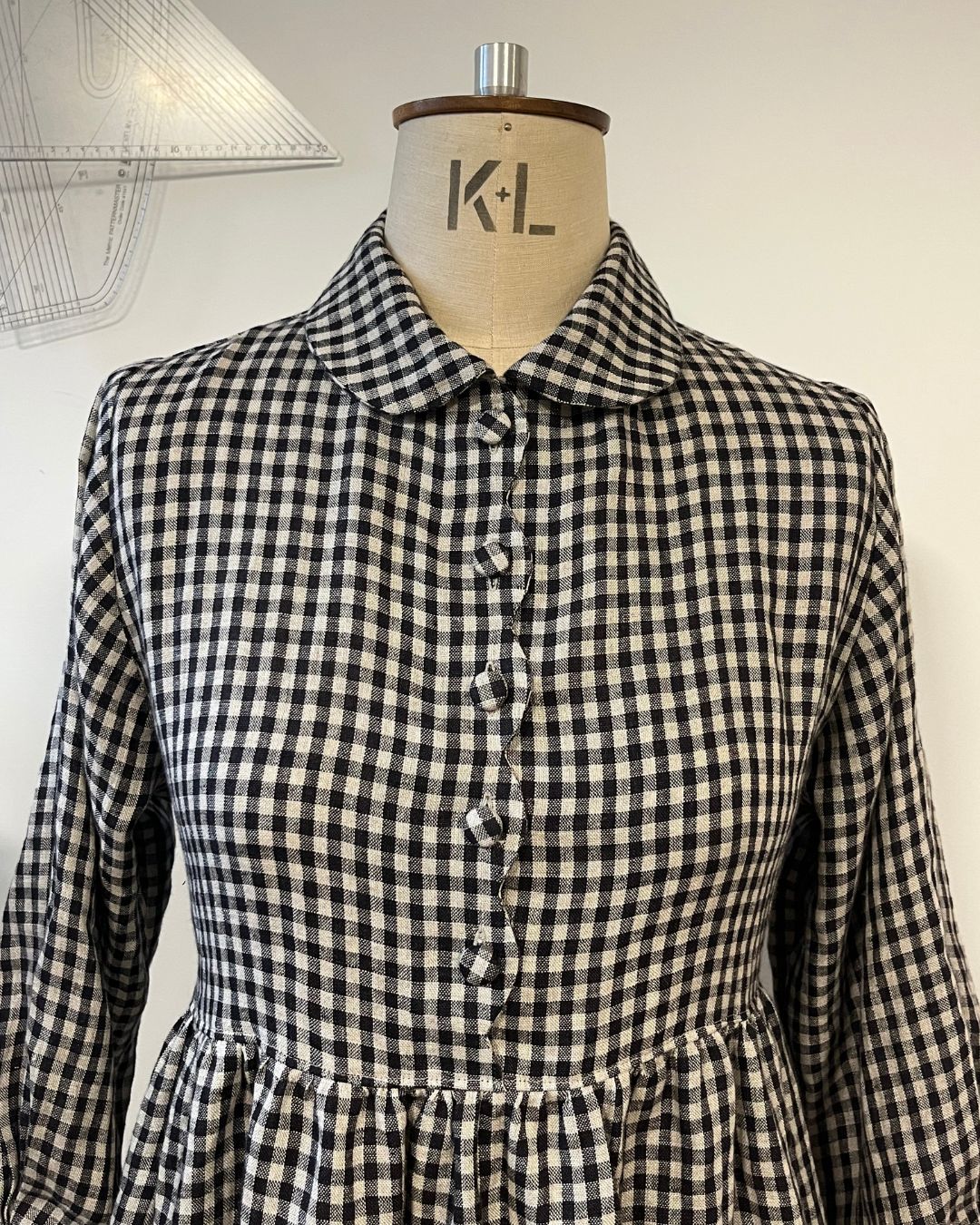A luxurious linen dress with a lovely scalloped front detail. A soft Peter Pan collar sits comfortably on the collar bone. Covered buttons provide a touch of nostalgia. A versatile dress, with a self fabric tie belt.