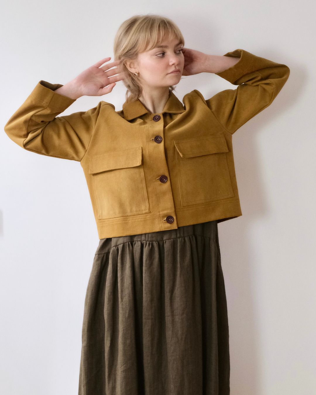 A boxy jacket with oversized pockets. Ravilious pays homage to classic workwear uniforms with added floral contrasts for a feminine touch. looks great over dresses, skirts or jeans. Every jacket is trimmed using our zero waste off cuts so no two will ever be the same! Stylish and unique for today, tomorrow and every day.